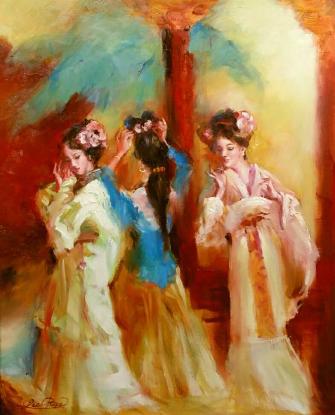 油彩细秀,线条清朗,艳丽淡雅,人物写意,笔简意赅,不沾不滞,若即若离,中